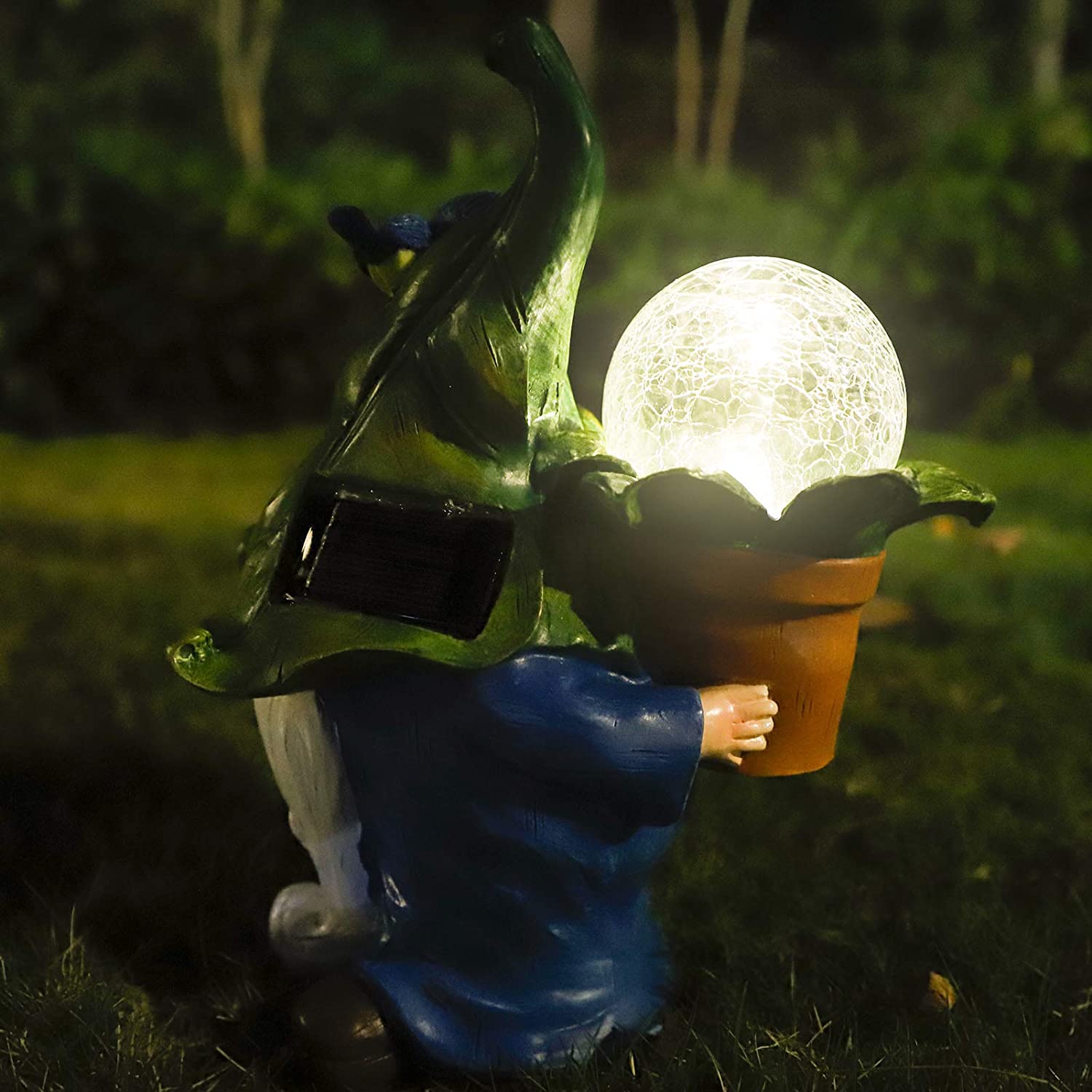 This figurine enchants your garden with magics and fun by holding his magic orb that glitters in the dark with the light coming out of the crack glass patterns on the ball.