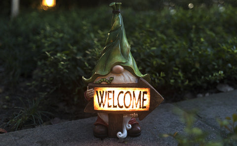 This Garden Gnome Statue is ready to greet you when you come home with his Welcome plaque sign at hand.
