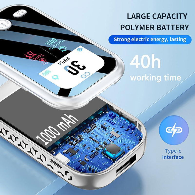 Built-in 1000 mAh rechargable battery. Come with one type-c USB, this carbon monoxide detector can continue working 50 hours when charging ful.