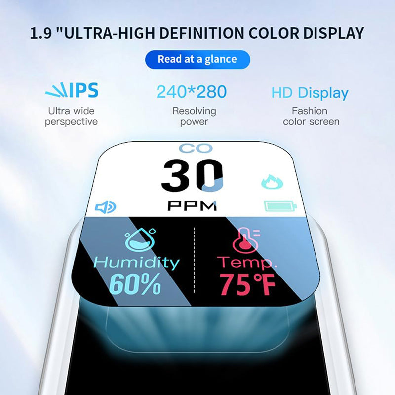 Electrochemistry working method. More accurate detection of carbon monoxide. There is no delay, real-time monitoring, and data is refreshed every 2 seconds shows on the color HD 1.9’’ screen, so that you can always know the air quality of the environment.